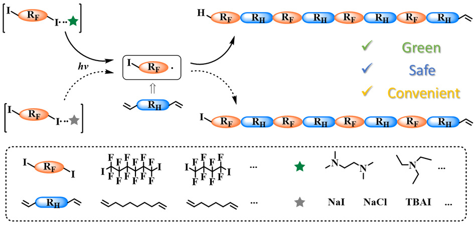 在这项工作中,我们报告了一种组分简单且成本低廉的方法,通过在α,ω-二碘代全氟烷烃和胺类/卤素盐之间形成卤素键(XB)络合物来制备主链型半氟化交替共聚物。有趣的是,聚合物链末端的碘官能团在胺促进的聚合体系中很容易丢失,而加入少量水可以显着减少链转移。重要的是,卤素盐促进的聚合体系可以确保碘官能团的完全保留。总体而言,该方法的建立为在室温可见光照射下以绿色环保的方式制备功能化含氟聚合物材料提供了新的策略。