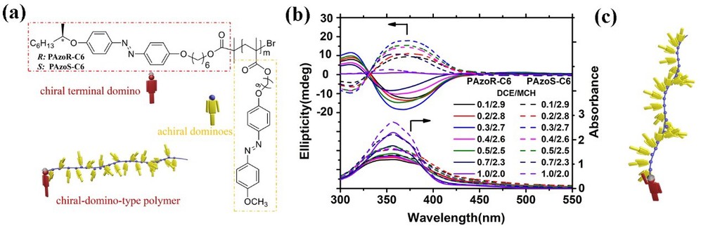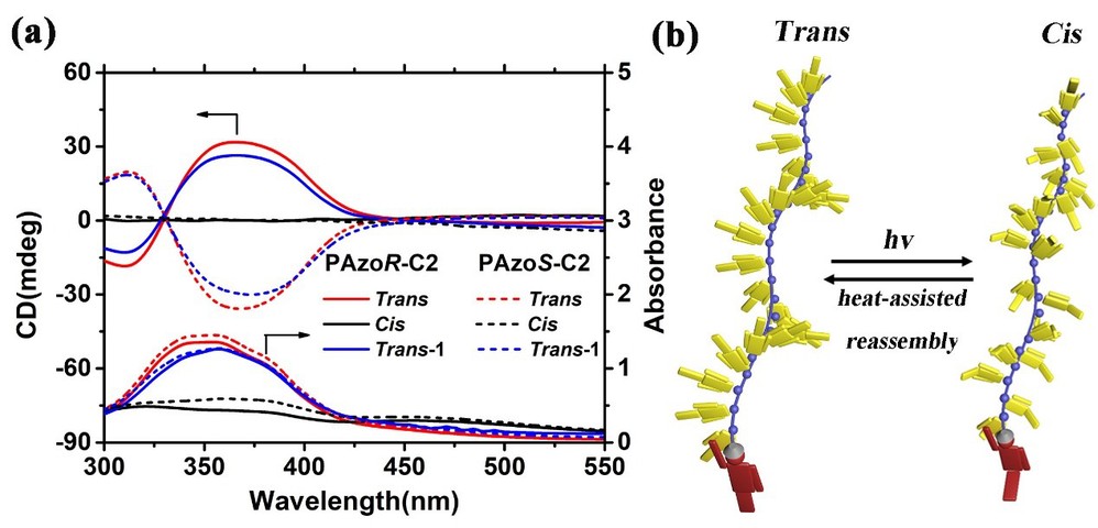 本文通过原子转移自由基聚合法制备了以手性α-偶氮苯(Azo)为手性端基,非手性Azo为构筑单元的新型手性多米诺型聚合物,实现了有趣的超分子手性诱导、传递和调控,并通过理论模拟进一步验证了手性共价多米诺效应(CCDE)。研究发现,在聚合物链末端的一个手性基团可诱导非手性Azo单元在聚集态下形成螺旋结构,将分子的手性转移并放大到整个超分子聚集体(图1)。更有趣的是,具有相同绝对构型但间隔长度不同的手性端可以用来构建具有相反螺旋方向的非手性Azo聚集体。此外,由于CCDE提供了特定的螺旋排列方向,聚合物的超分子手性可以在不借助任何外部手性刺激的情况下,通过Azo的光异构化和热辅助重组过程来调控和重建(图2)。