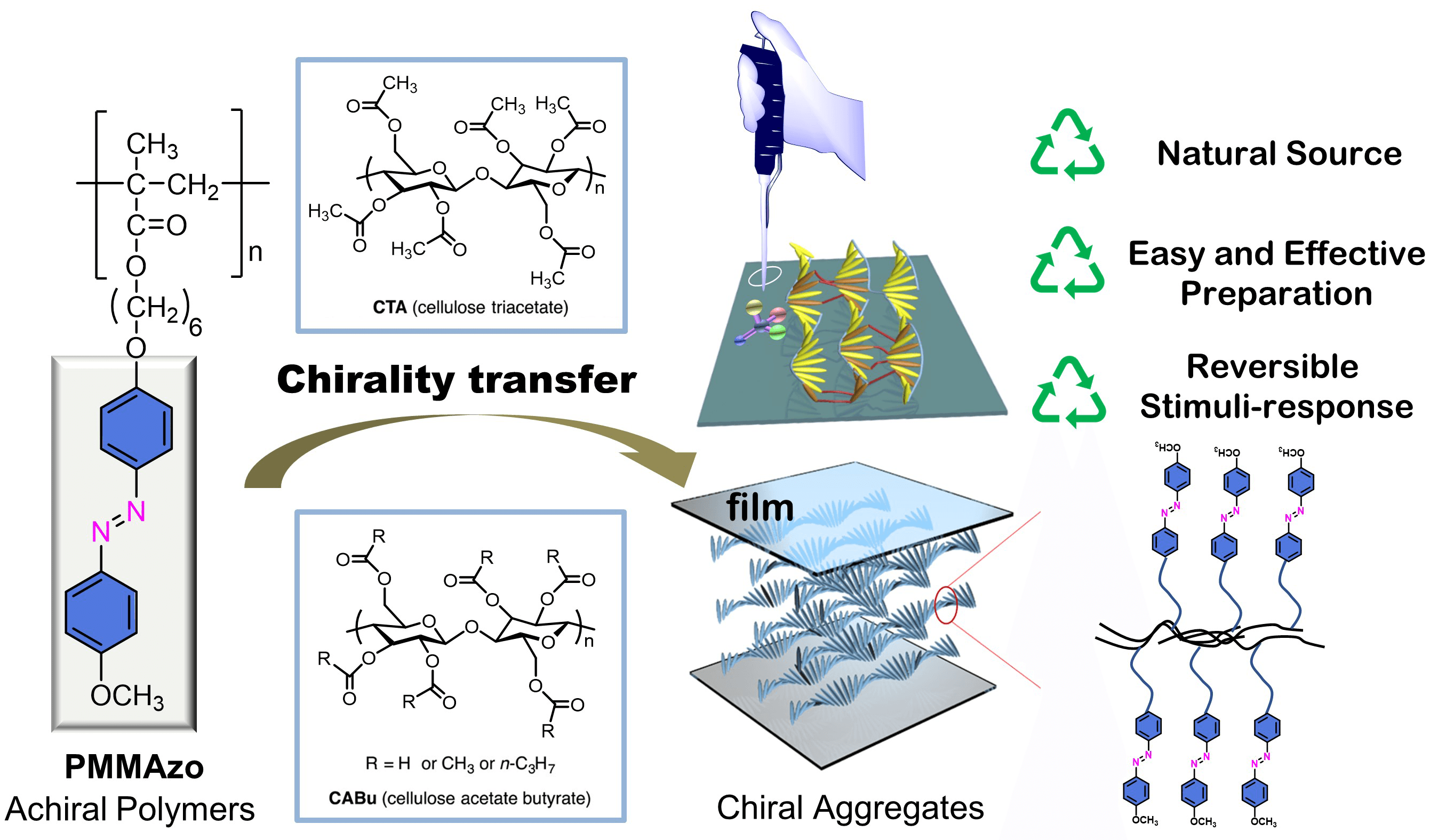光学活性聚合物可提供复杂的手性相关功能,如不对称催化、紫外-可见-近红外区域的手性光学转换和记忆、对映体色谱分离以及分子手性传感器。最近,研究人员在绿色生物源材料的帮助下,通过分子间相互作用,从非手性聚合物设计手性超分子结构,受到了广泛的关注。本文报道了当非手性偶氮苯乙烯基聚合物与天然纤维素和D-/L-葡萄糖的烷基酯衍生物共混成膜时,通过非共价相互作用使偶氮苯聚合物瞬间产生了超分子手性,最终揭示了紫外-可见光区域的光驱动手性光学转换/记忆。因此,半合成生物材料可以有效地作为几种非手性和光学非活性分子、低聚物和聚合物的手性诱导支架。我们的结果成功揭示了一种新方法,即廉价的多糖/单糖衍生物如何能够以最少的能量、时间和成本在非手性聚合物中提供超分子手性光学体系。