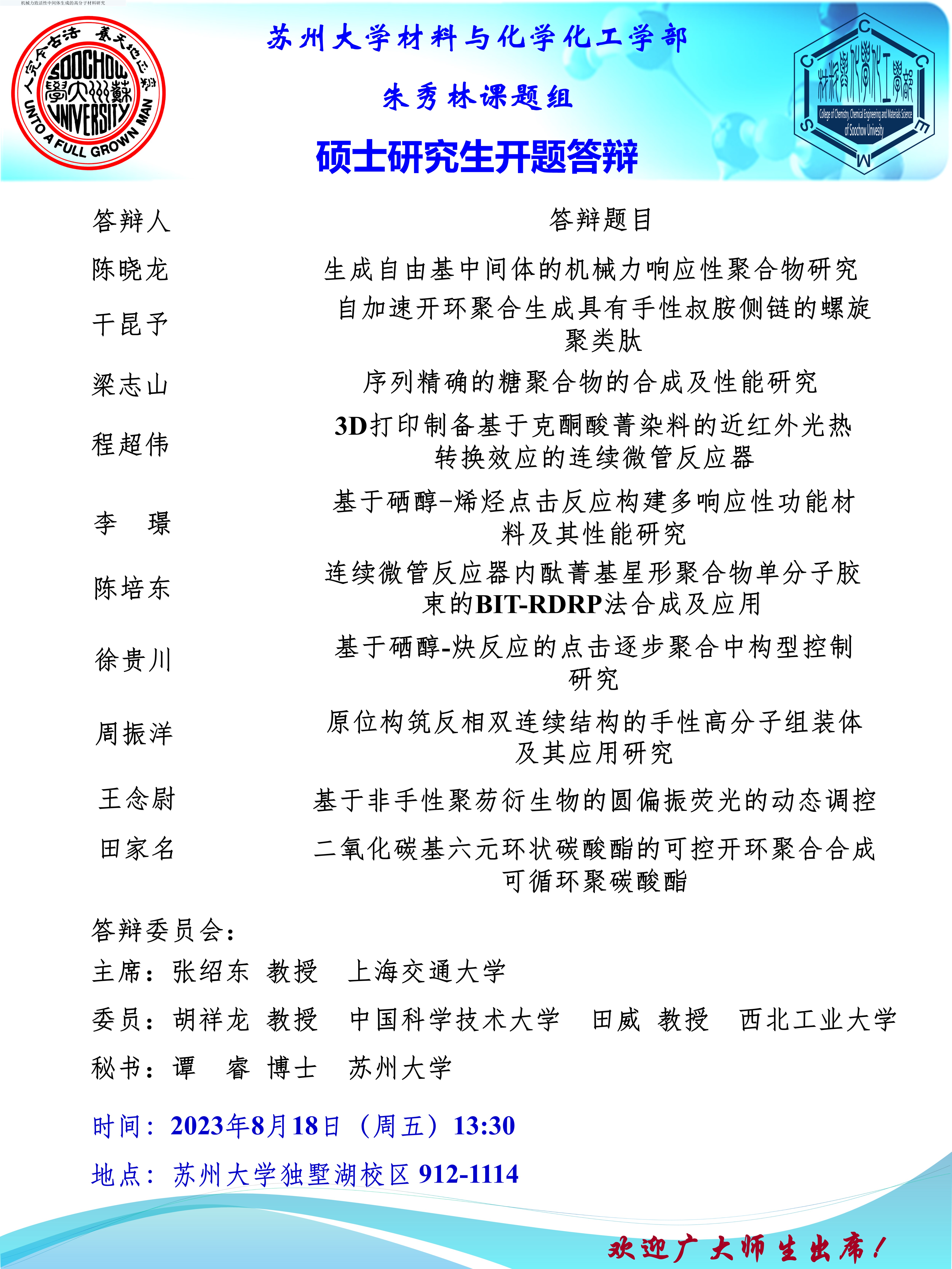 2023年08月18-20日,下午13:30,苏州市大分子设计与精密合成重点实验室硕士研究生开题和中期答辩在912-1113成功举办。答辩委员会为上海交通大学张绍东教授(答辩委员会主席),西北工业大学田威教授,中国科学技术大学胡祥龙教授,苏州大学谭睿博士担任会议秘书。