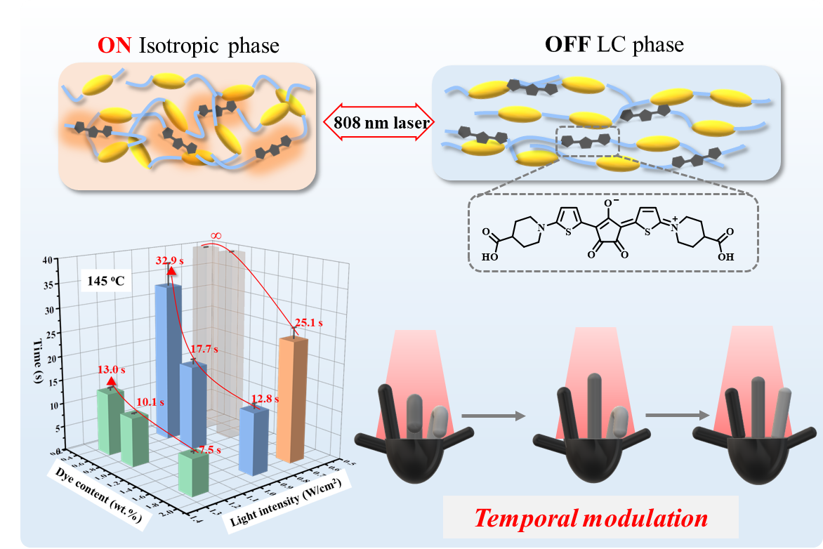 光响应的软执行器可以被光源选择性地驱动,但要在均匀的光场下实现多种成分的选择性响应是具有挑战性的,这对软体机器人的发展具有重要意义。在本工作中,我们以含羧基的克酮酸菁染料(CR-800)作为光热剂,通过羧酸酯化法合成了一系列具有近红外光(NIR)响应性的类玻璃高分子(CR-vitrimers)。在没有模板的近红外激光(λmax = 808 nm)下,可以进一步制备近红外响应的液晶弹性体(CR-vitrimer-LCEs)。更重要的是,类玻璃高分子的动态共价键特性允许通过热压的形式制造手形执行器,它由具有不同近红外响应阈值的“手指”组成。在根据需要进行编程后,手形执行器在均匀的近红外光场下成功实现了局部和顺序控制。