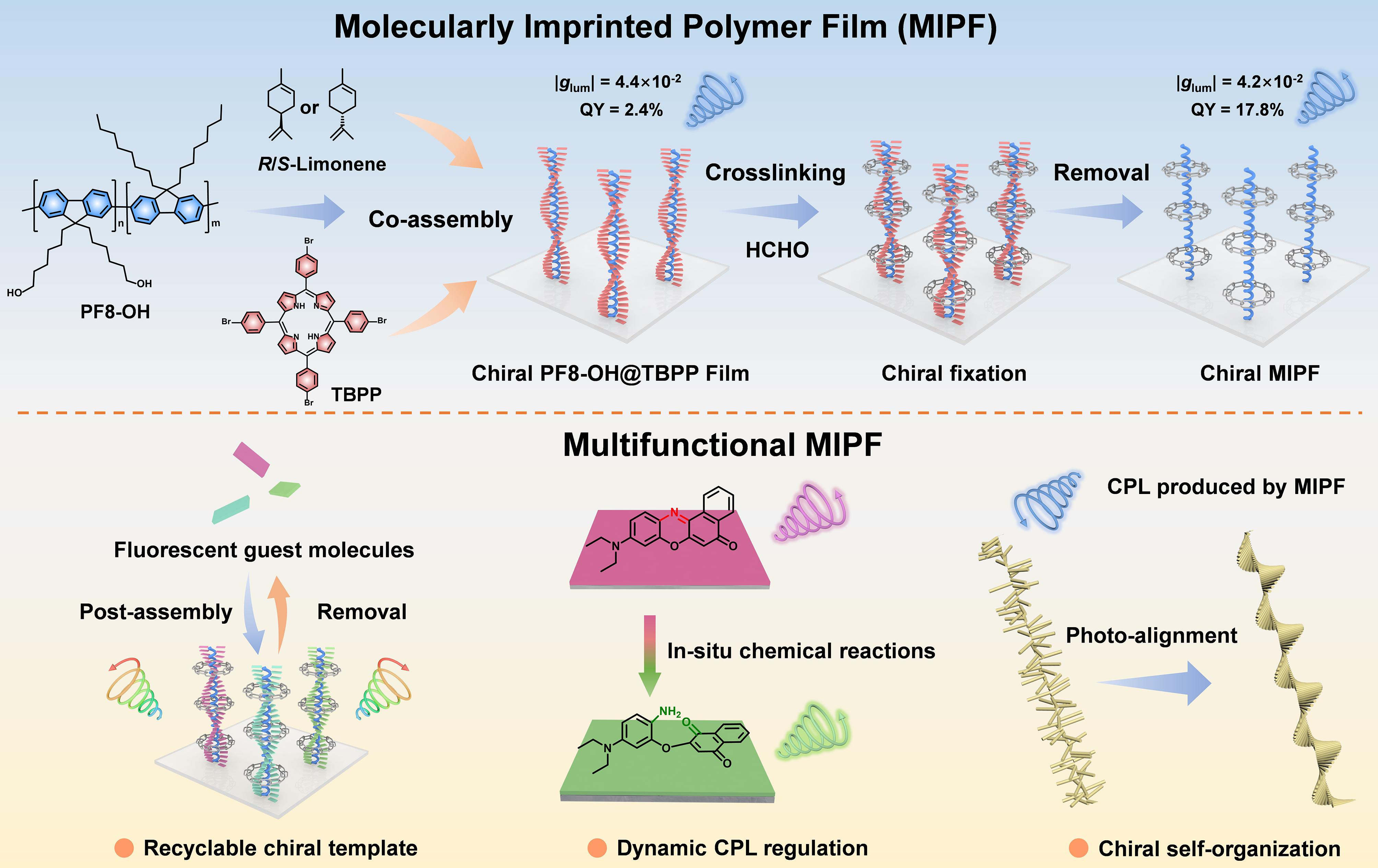 该研究利用分子印迹策略的方法通过界面超分子组装制备出了高性能CPL活性聚合物薄膜。首先,非手性芴基聚合物与卟啉衍生物(TBPP)在柠檬烯的作用下进行共组装。随后,通过链间交联进一步实现了聚合物薄膜的手性固定和稳定性的提高。最后通过溶剂效应有效地去除所有小分子,得到了高具有品质因子的手性分子印迹聚合物薄膜(MIPF)。TBPP的去除为各种荧光客体分子提供了手性位点,再通过后组装过程的手性转移实现全色CPL发射。利用这种方法,白色的CPL发射也可以通过AIE和ACQ客体分子混合后组装来获得。同时,手性MIPF可以用作界面微反应器,通过原位化学反应实现可调控的CPL发射。此外,凭借其较高的品质因子,手性MIPF可以作为手性光源通过CPL辐照的方式对非手性偶氮苯聚合物薄膜进行手性诱导。总的来说,手性MIPF具有优异的CPL性能和多方面应用,进一步拓宽了CPL材料的应用。