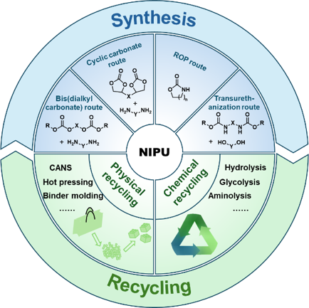 聚氨酯(PUs)是一类应用广泛的高分子材料,以其优异的性能而闻名。然而,传统的聚氨酯合成严重依赖有毒的异氰酸酯,带来了显著的环境和健康风险。为了缓解这些问题,研究越来越多地集中在非异氰酸酯聚氨酯(NIPUs)的合成上。本综述系统地讨论了NIPUs的主要绿色合成路线:(1)双(烷基碳酸酯)路线,(2)转氨基甲酸酯化路线,(3)环状碳酸酯路线,以及(4)开环聚合(ROP)路线。尽管PUs表现出优异的机械和化学性能,但其生命周期末端的处置仍然是一个主要挑战。目前,主要的回收方法包括化学降解(或原料再生)和机械回收,其中化学回收为闭环工艺提供了可能。本综述简要总结了这些处理策略,旨在鼓励可持续的实践。它强调了绿色合成和回收技术的最新进展,重点关注用于创造环保且可回收非异氰酸酯聚氨酯(NIPUs)的途径。