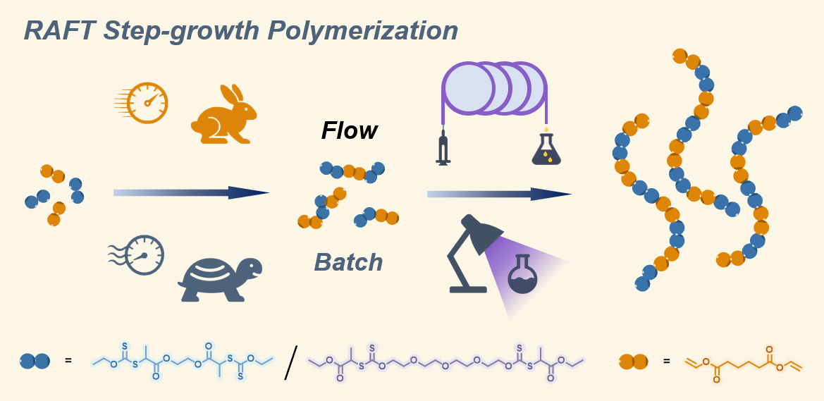 本文报道了一种连续流动条件下的光引发RAFT逐步聚合新策略,通过微流反应工程显著提升了逐步聚合效率与结构可控性。相比传统间歇体系,单个单元插入(SUMI)模型反应中反应时间由72 h缩短至12 h即可达到相同反应程度(p= 0.74),在48 h内进一步提升至p= 0.86。在A2+B2型RAFT逐步聚合中,连续流体系使反应时间整体缩短约4倍。通过在线扩链模块,实现了接枝与多嵌段共聚物的连续合成,接枝共聚物重均分子量由3.9 k提升至11.7 k,多嵌段共聚物由9.2 k提升至41.2 k。进一步引入交替尖刺结构微通道反应器后,聚合物Mw提高至14.0 k,反应程度接近完全(p = 0.97),分散度降低至Đ= 1.53。该工作通过流动工程与RAFT逐步聚合机制的协同设计,实现了更快动力学、更高转化率和更优分子量控制,为可降解高分子材料的连续化、模块化制备提供了新的解决方案。