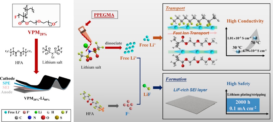 由于聚合物对锂盐的解离和离子传输能力较差,固态聚合物电解质通常表现出较低的室温离子电导率。在这项工作中,我们首先以聚偏氟乙烯(PVDF)为大分子引发剂,通过铁介导的原子转移自由基聚合(ATRP)合成了聚(聚乙二醇甲基丙烯酸酯) (PPEGMA)接枝聚偏氟乙烯(PVDF) (PVDF-g-PPEGMA)。然后,我们制备了基于PPEGMA接枝PVDF (VPMX%-Li80%)的固态盐浓度(双三氟甲烷磺酰亚胺锂盐和二氟二氧磷酸锂)聚合物电解质,结合多种离子传输途径来增强室温下的离子电导率。研究了接枝率对电解质性能的影响。优化后的VPM28%-Li80%在30 ℃时获得4.79 × 10-4 S cm-1的高离子电导率,并在70 ℃时超过10-3S cm-1的阈值。