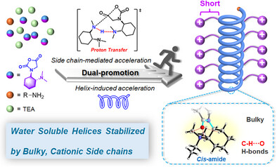 天然阳离子螺旋(如含有赖氨酸和精氨酸的多肽)在生物过程中具有重要作用,但其螺旋结构常因侧链静电排斥而不稳定。传统多肽中引入带电残基会破坏维持α-螺旋结构的氢键,导致螺旋性丧失。本文通过可控开环聚合,将体积庞大的手性叔胺侧链引入聚类肽化合物中,使非手性主链形成稳定螺旋结构。尽管侧链空间位阻较大,该环状单体仍通过双重自促进机制实现高效聚合,这一机制包括侧链介导的质子转移和螺旋诱导加速效应。与传统阳离子多肽聚l-赖氨酸相比,该阳离子螺旋聚肽类化合物具有显著更低的细胞毒性和更快的细胞摄取动力学。这种双重自促进合成策略,结合阳离子侧链介导的螺旋稳定作用,为设计先进功能聚合物提供了新思路。此外,这类阳离子聚肽类化合物兼具稳定的螺旋结构、低细胞毒性和高细胞摄取效率,在多种生物应用领域具有广阔前景。