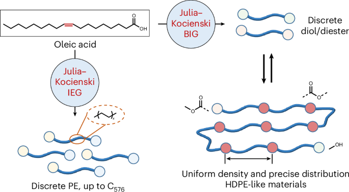类似聚乙烯的材料由长链寡乙烯单元以及可发生化学断裂的连接键组成,因此它们成为化学性质稳定的聚乙烯的一种有前景的替代品,同时仍能保持类似的性能。为了保持聚乙烯的结晶性,通常更倾向于使用链长较长且分布均匀的寡乙烯单元;然而,要高效地合成纯度较高的超长链寡乙烯却仍然是一个挑战。在这里,我们报道了利用Julia–Kocienski反应精确合成链长可达576个碳原子的寡乙烯的方法。以这些寡乙烯单元作为构建块,我们制备出了一系列具有规则分布的酯键结构的高密度类似聚乙烯的材料。链长为126个碳原子的寡乙烯表现出优异的热性能和机械性能。由于寡乙烯单元的均匀性,这种类似聚乙烯的材料至少可以进行五次循环的化学回收利用,而且在此过程中不会出现成分不均匀或批次间性能波动的问题。我们这种用于合成超长链寡乙烯的方法,对于开发新一代可回收材料具有重要意义。