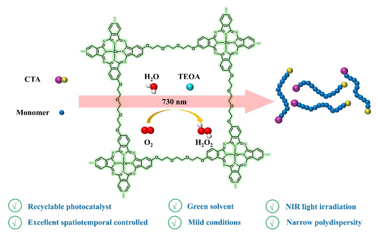优异的催化剂在各种可控聚合反应中发挥着关键作用,也是研究人员一直追求的目标。在这项工作中,首次使用柔性三甘醇桥接酞菁锌,形成酞菁锌共价聚合物(ZnPc-CPs)。ZnPc-CPs作为生成单线态氧(1O2)的高效非均相光催化剂,在NIR光(λmax = 730 nm)照射下催化水相RAFT聚合反应。氧含量对这一体系的聚合反应至关重要,聚合过程中的微量氧气会产生高活性的过氧化氢引发剂,从而加速聚合。而由于氧气对自由基的猝灭能力,过量的氧气则会导致聚合反应不能进行。此外,得益于近红外光的高穿透力,聚合反应在存在障碍物的情况下仍能继续进行。更重要的是,与均相光催化剂相比,非均相ZnPc-CPs只需进行简单的后处理就可重复使用,并且在催化效率不显著降低的情况下循环使用。利用NIR光照射、水作为溶剂、可回收的非均相光催化剂以及无需事先脱氧等显著优势,使这种聚合体系不仅易于操作,而且非常经济环保。