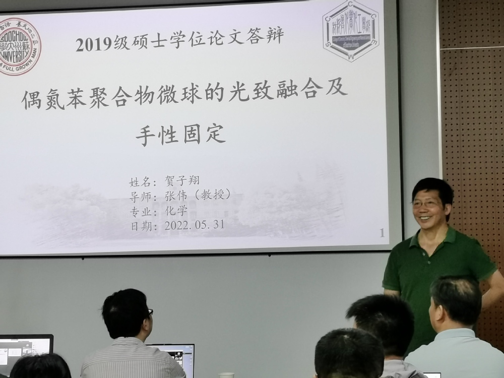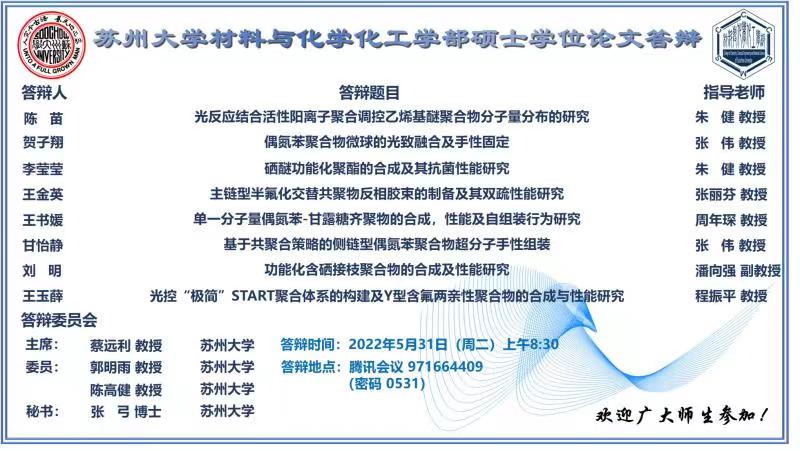 2022年5月31日,课题组举行硕士研究生的毕业答辩,苏州市大分子设计与精密合成重点实验室硕士研究生学位论文答辩在912-1114成功举行。