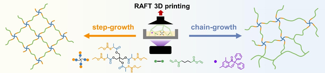 Tuning the Mechanical Properties of 3D-printed Objects by the RAFT Process: From Chain-Growth to Step-Growth