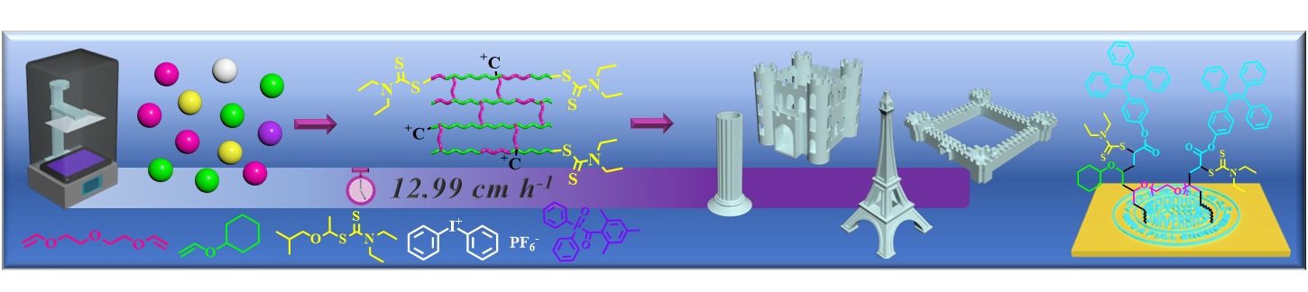 基于可逆失活自由基聚合技术(RDRP)的3D打印是构建“活”聚合物网络的一种强大方法,这种“活”网络可以很容易地进行后功能化修饰从而制备功能性聚合物材料。然而,与商业系统相比,基于RDRP系统3D打印的构建速度仍然有限。在此,我们报道了一种基于数字光处理技术(DLP)的活性3D打印系统,该系统通过乙烯基醚的光诱导自由基促进的阳离子可逆加成-断裂链转移聚合过程,可以在商业DLP 3D打印机种以相对较快的构建速度(12.99 cm h–1)构建“活”物体。本文详细研究了光诱导自由基促进的阳离子可逆加成-断裂链转移聚合行为和3D打印的条件并通过荧光功能单体对打印的物体进行后功能化修饰以制备荧光防伪材料。这为快速制备具有不同功能和结构的3D聚合物材料提供了途径。