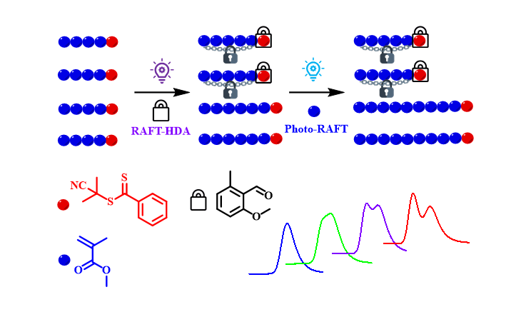 聚合物分子量分布 (MWD) 或分散度 (Đ) 是决定聚合物材料性能重要参数。近年来,实现聚合物 MWD的精准调控已成为高分子合成化学中的重要研究方向。我们提出了一种通过切换外部光源的方式调控聚合物MWD的方法。该方法的关键是在聚合过程中利用光反应使部分增长链发生链终止,剩余的增长链则继续聚合,通过光照时长控制在不同时间终止不同数量的聚合物链实现聚合物分子量分布的精准调控。此外,我们还合成了一种带有羟基的活性双烯化合物,并成功应用于这一策略。这样可进一步利用终止链末端的羟基进行ɛ-己内酯(ɛ-CL)的开环聚合(ROP)实现扩链,制备具有不同MWD的嵌段共聚物,从而开展MWD对嵌段共聚物性能影响的研究。