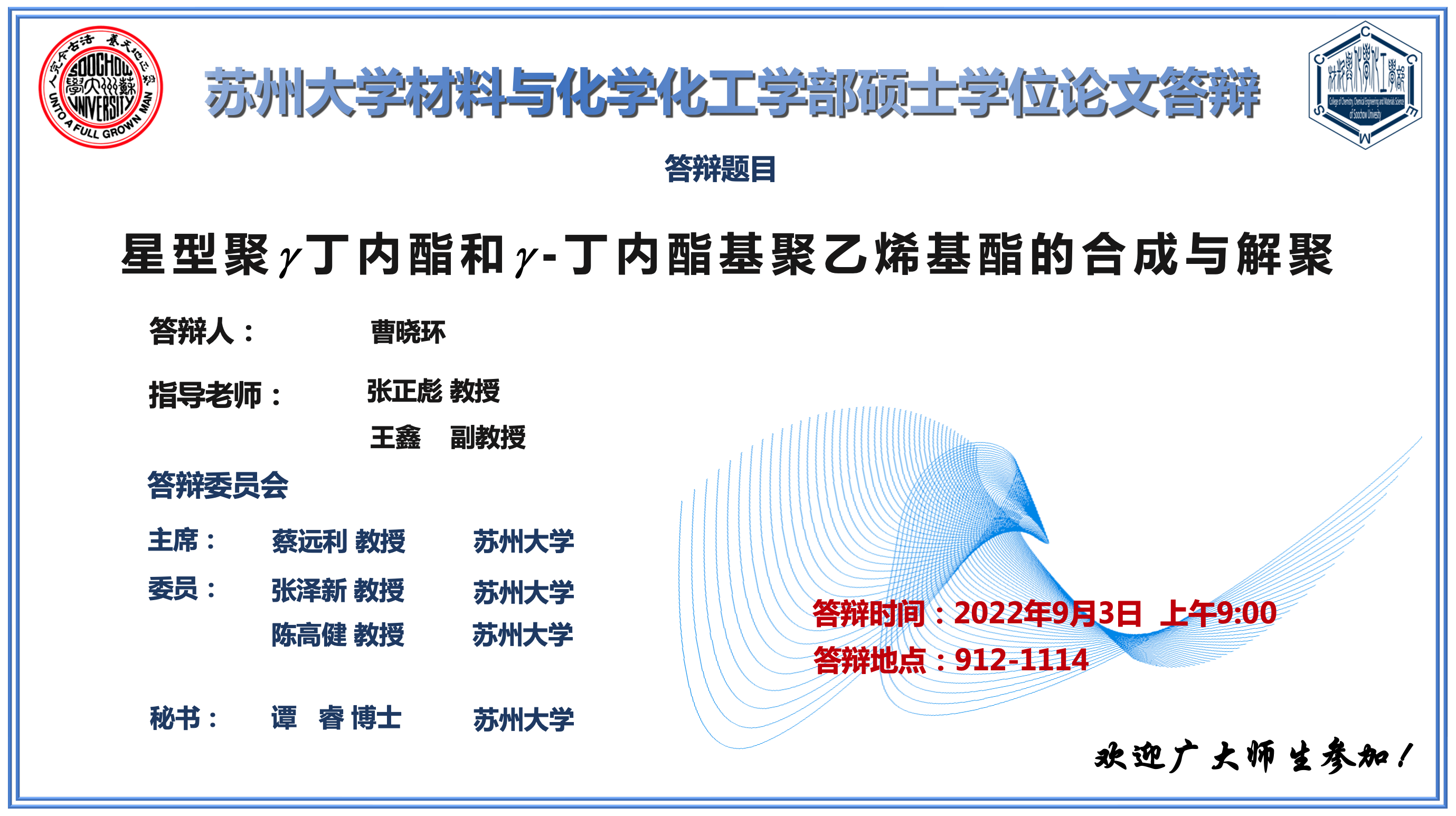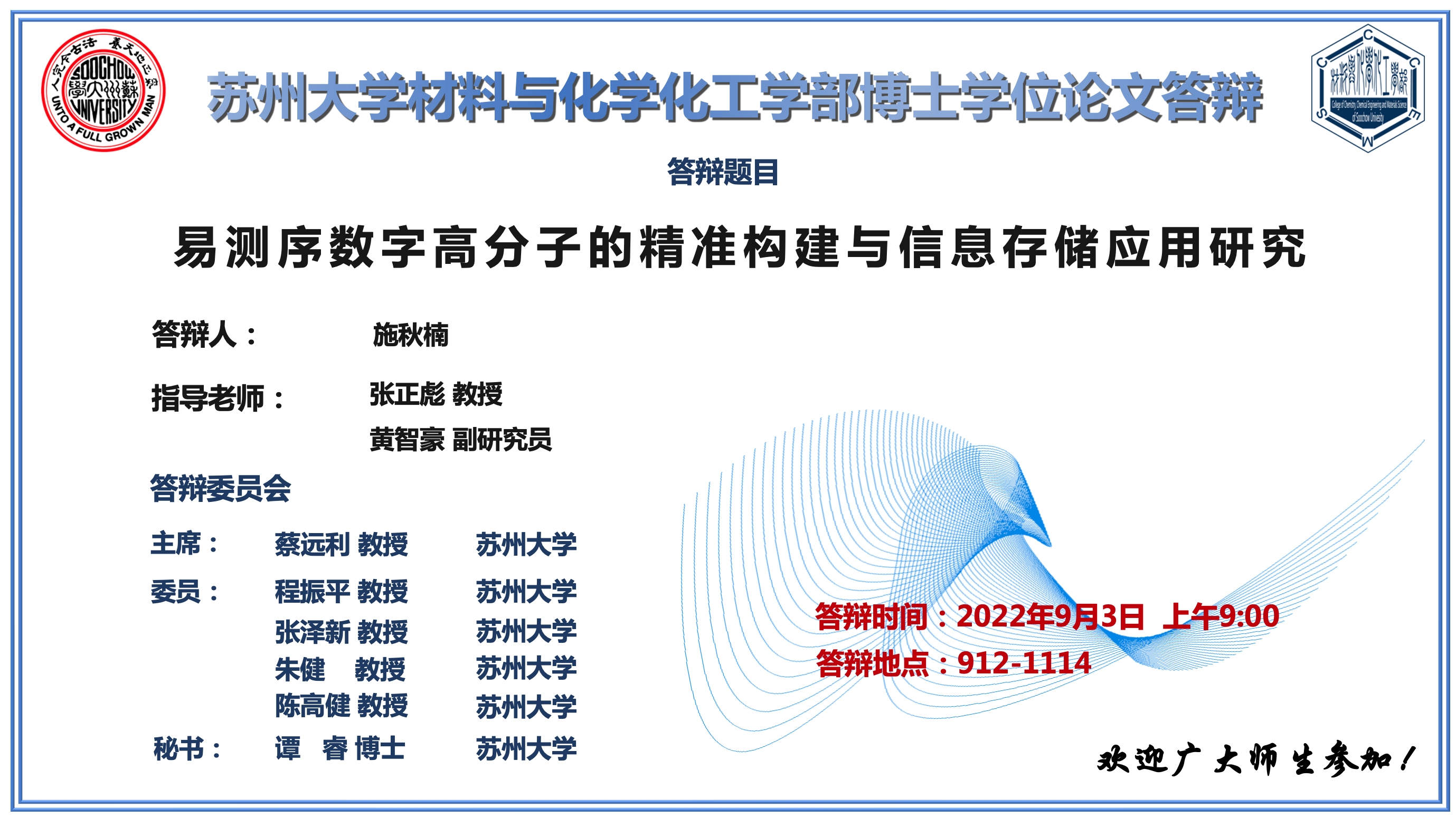 2022年9月3日,课题组举行施秋楠博士生与曹晓环硕士研究生的毕业答辩,苏州市大分子设计与精密合成重点实验室硕士研究生学位论文答辩在912-1114成功举行。