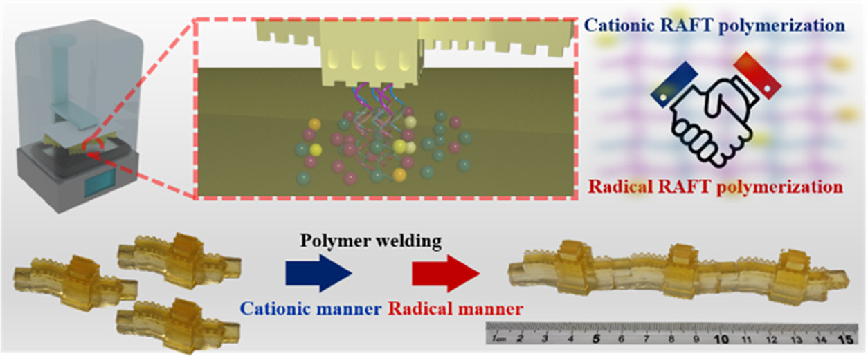 基于光聚合的 3D 打印技术已被广泛用于制备具有复杂结构的聚合物材料。可逆失活自由基聚合 (RDRP) 在 3D 打印中的应用使打印出来的聚合物材料具有更加丰富的功能以及后聚合修饰的特点,但这项技术仍处于早期发展阶段。在此,开发了一种光诱导自由基促进的阳离子可逆加成断裂链转移(RAFT)聚合方法,利用RAFT试剂的直接光裂解作为自由基源,进一步结合光诱导自由基RAFT聚合制备聚合物网络。通过使用单官能单体的模型聚合研究了聚合机理,详细探索了各组分对最终材料性能和交联体系聚合行为的影响。该方法已成功应用于基于数字光处理 (DLP) 技术的商用 3D 打印机中。最后,通过阳离子和自由基 RAFT 聚合扩链实现了打印物体的焊接,拓宽了光聚合 3D打印技术的后功能化途径及其未来在各个领域的应用。