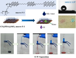 超疏水材料的发展因其在包括油水分离在内的各种领域的潜在应用前景而引起了极大的关注。在这项工作中,基于氟化交替共聚物和二氧化硅纳米粒子制备了耐用和坚固的超疏水棉织物。原位制备二氧化硅纳米粒子并固定在聚多巴胺(PDA)包裹的棉织物表面,然后用氟化嵌段共聚物(AB2)nA-b-PIPMSAm,修饰,再去除聚合物上的碘,制备水接触角高达160.8°的超疏水棉织物。制备的棉织物耐用,对各种有机溶剂、酸、碱、热水、超声和机械磨损表现出优异的耐受性。实现了高分离效率(最高99.6 %)和令人满意的可重复使用性,用于油/水混合物的连续分离。重复分离50次后,三氯甲烷/水混合物的分离效率仍高达94 %。此外,油包水乳液也可以有效处理,显示出很高的实际应用潜力。