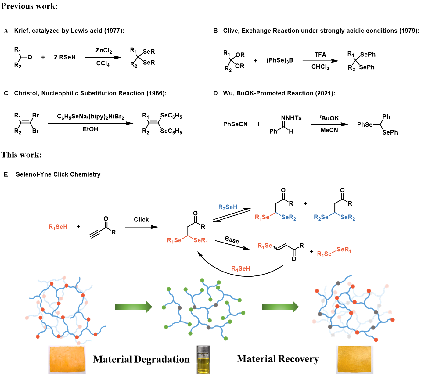 基于动态共价键(DCBs)的共价自适应性网络(CANs)为实现资源的回收和利用提供了一条有前景的途径。在这项研究中,作者通过硒醇和活性炔之间的双加成反应成功合成了硒缩醛。密度泛函理论(DFT)计算以及实验证明硒缩醛为动态共价键。利用这种高效的点击反应,作者在无催化剂条件下成功地合成了具有良好的愈合能力和再加工能力的硒缩醛动态材料。该材料可以在碱性条件下降解为烯丙基硒醚封端低聚物,重新引入硒醇可再次发生交联,实现材料的回收。值得一提的是,回收材料同时具有热响应性和光响应性。硒醇-炔点击反应为含硒智能响应聚合物在生物医学和可回收材料中的应用奠定了坚实的基础。