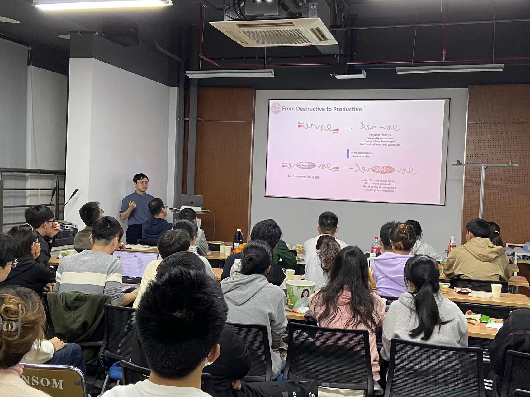 本次汇报沈行老师就机械力响应高分子领域的相关研究内容进行了详细的介绍。在这场学术盛宴中,同学们都积极踊跃地提出自己的问题,相互交流想法,拓展自我认知,让原本预定的一个半小时活动时间延长到了两个多小时,最终在20:30圆满结束。本年度第二次朱秀林课题组学术沙龙活动将于11月09日晚举办,主题为聚合物的手性研究,由程笑笑博士作题为“非均相体系手性聚合物的原位构筑”的汇报,敬请期待。